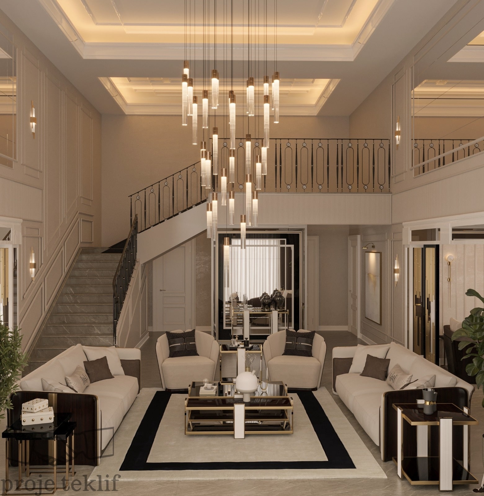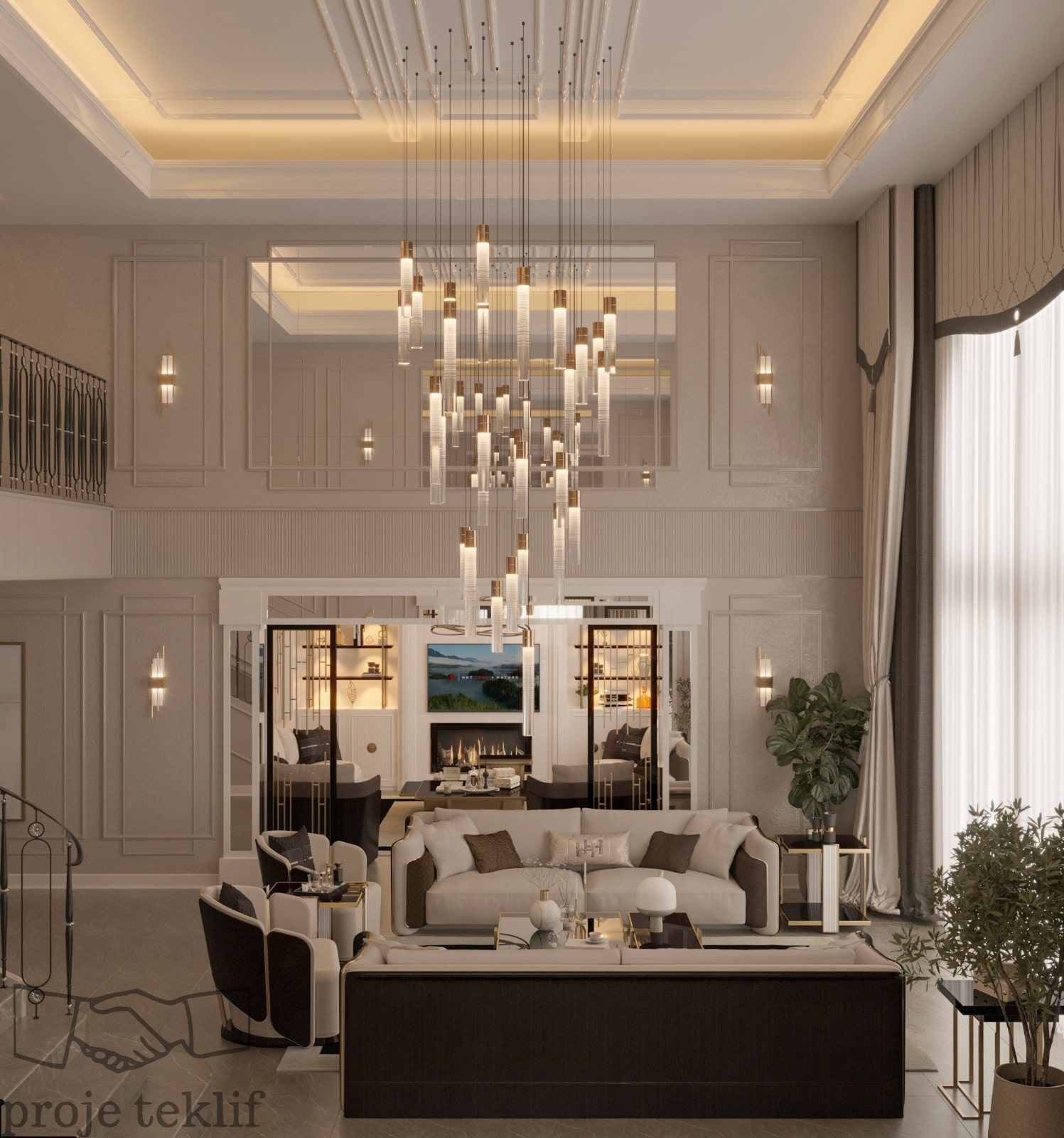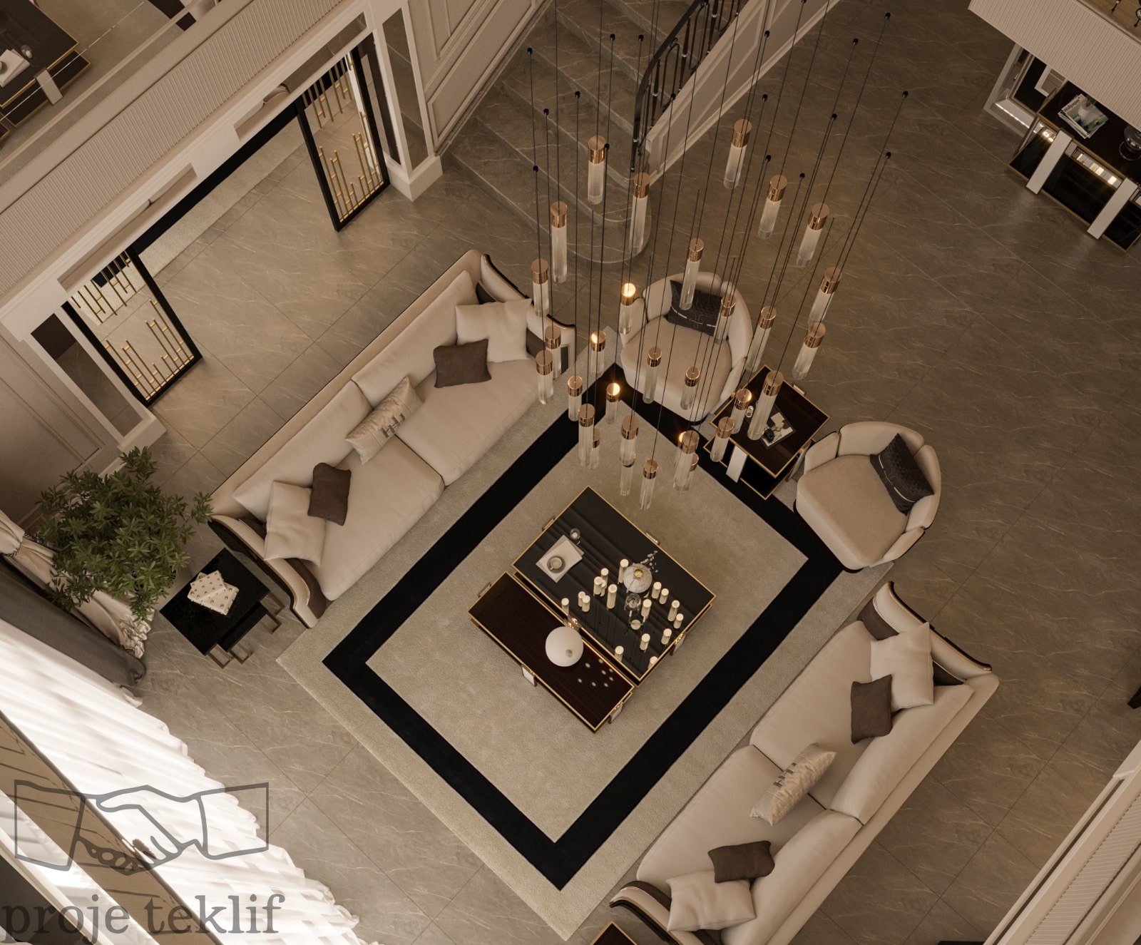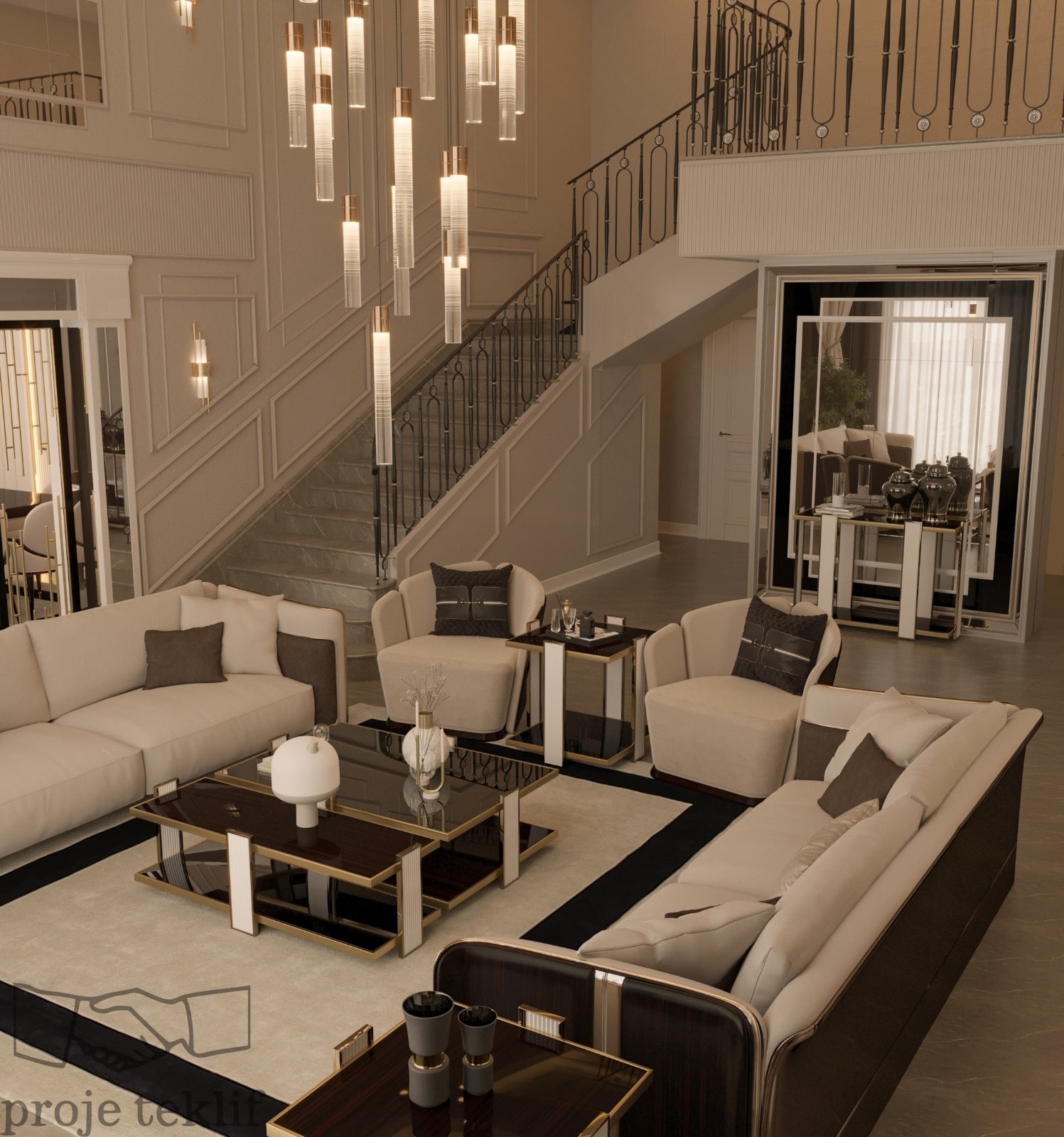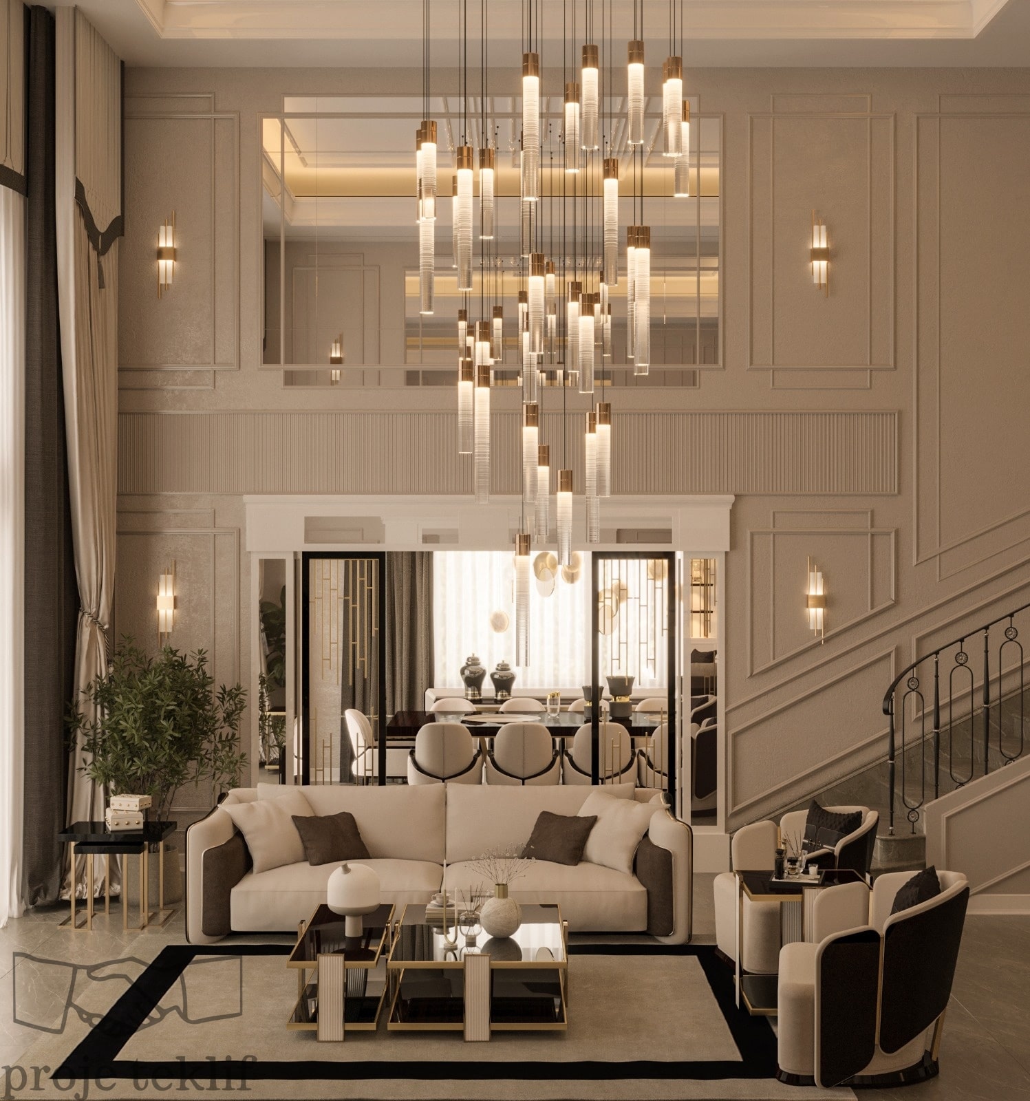 Bu projemiz, geniş ve ferah yaşam alanlarına sahip villalarda hem şıklığı hem de doğayla uyumu ön plana çıkaracak şekilde tasarlanmıştır. İç mekânlarda kullanılan doğal dokular, açık renk paletleri ve zarif mobilyalar sayesinde mekanlarda lüks bir sadelik yakalanmıştır. Geniş pencerelerle desteklenen doğal aydınlatma ve mekanlar arası akışkanlık, ferah ve davetkâr bir atmosfer oluşturmuştur.