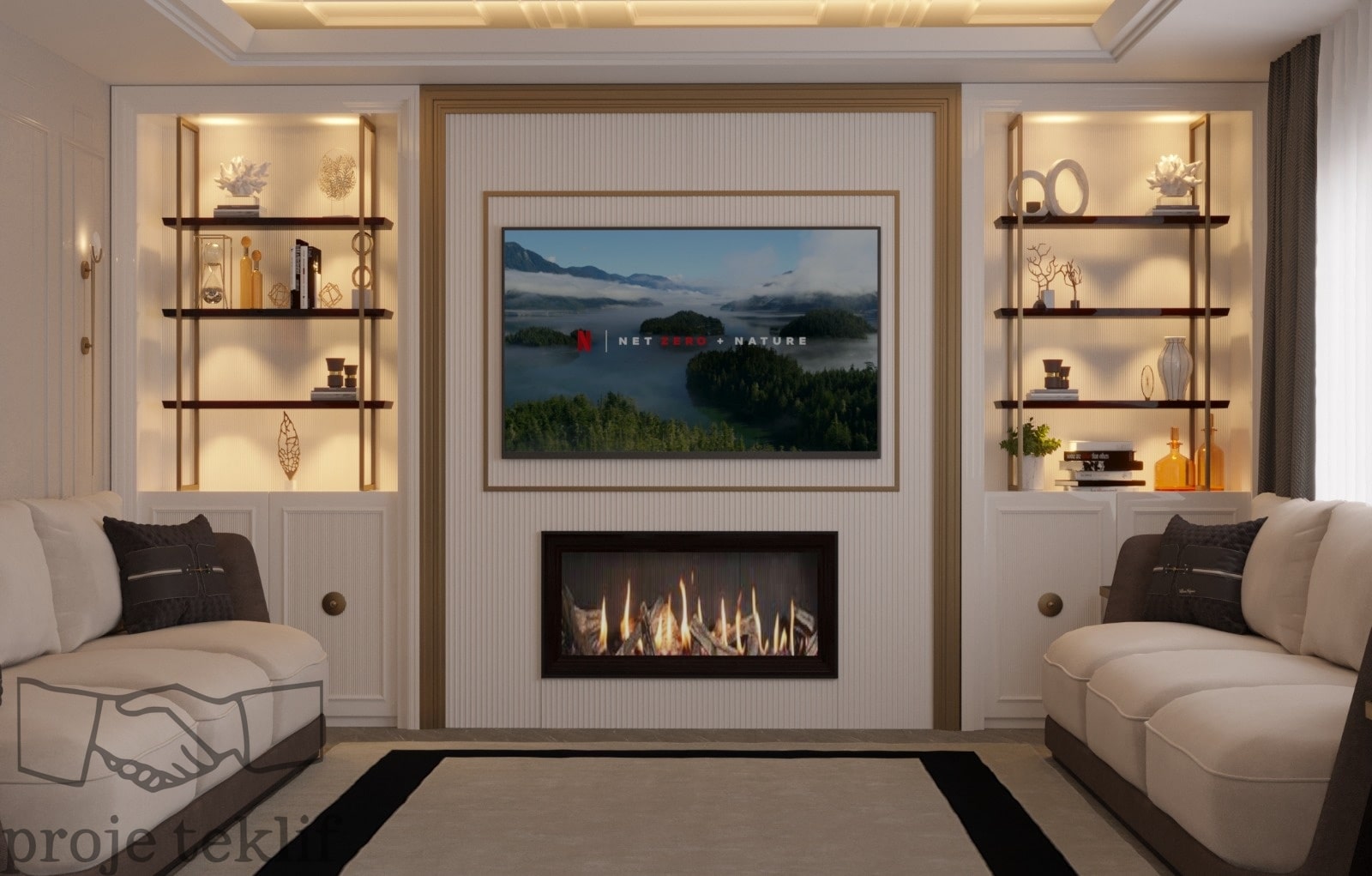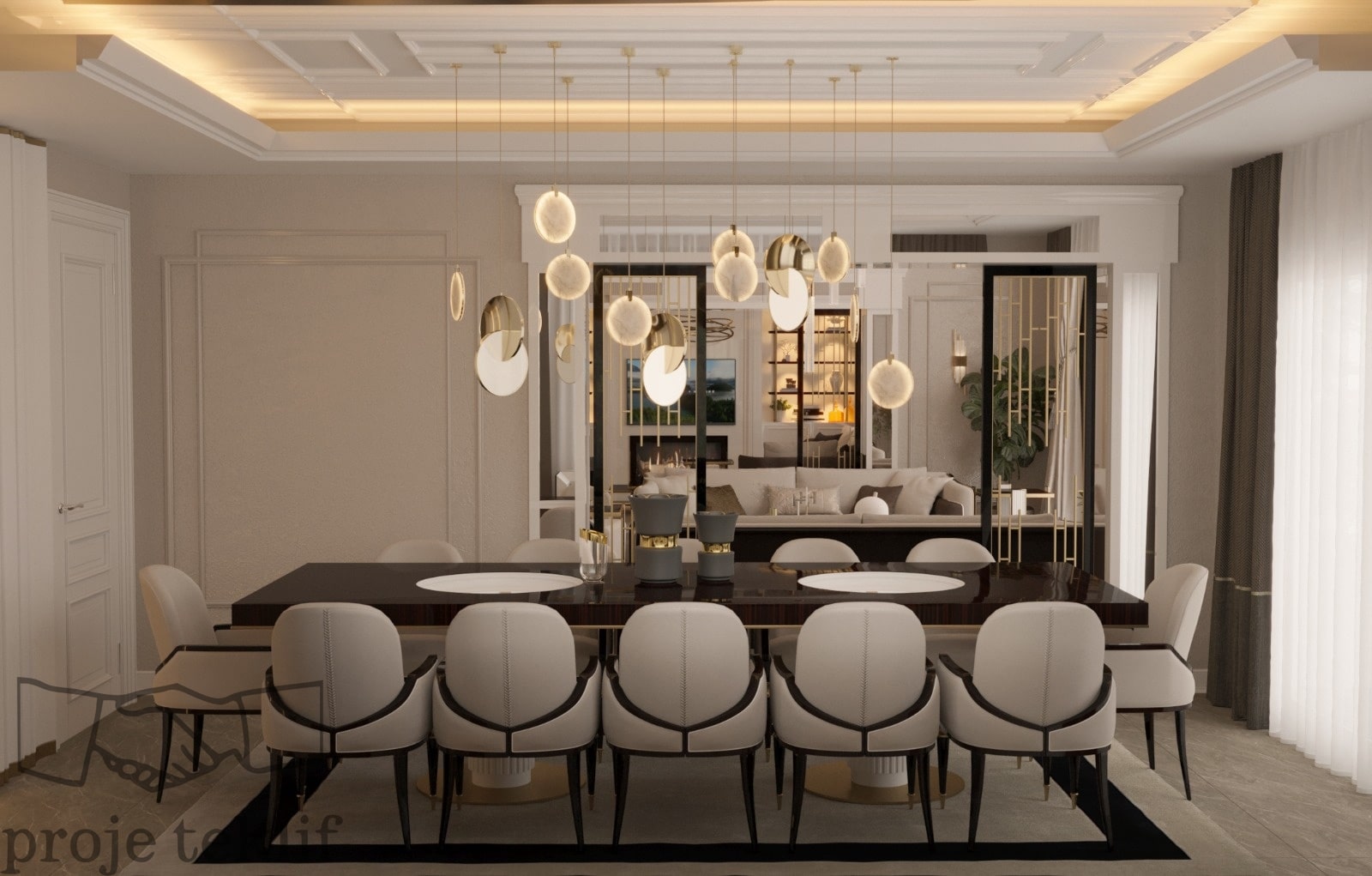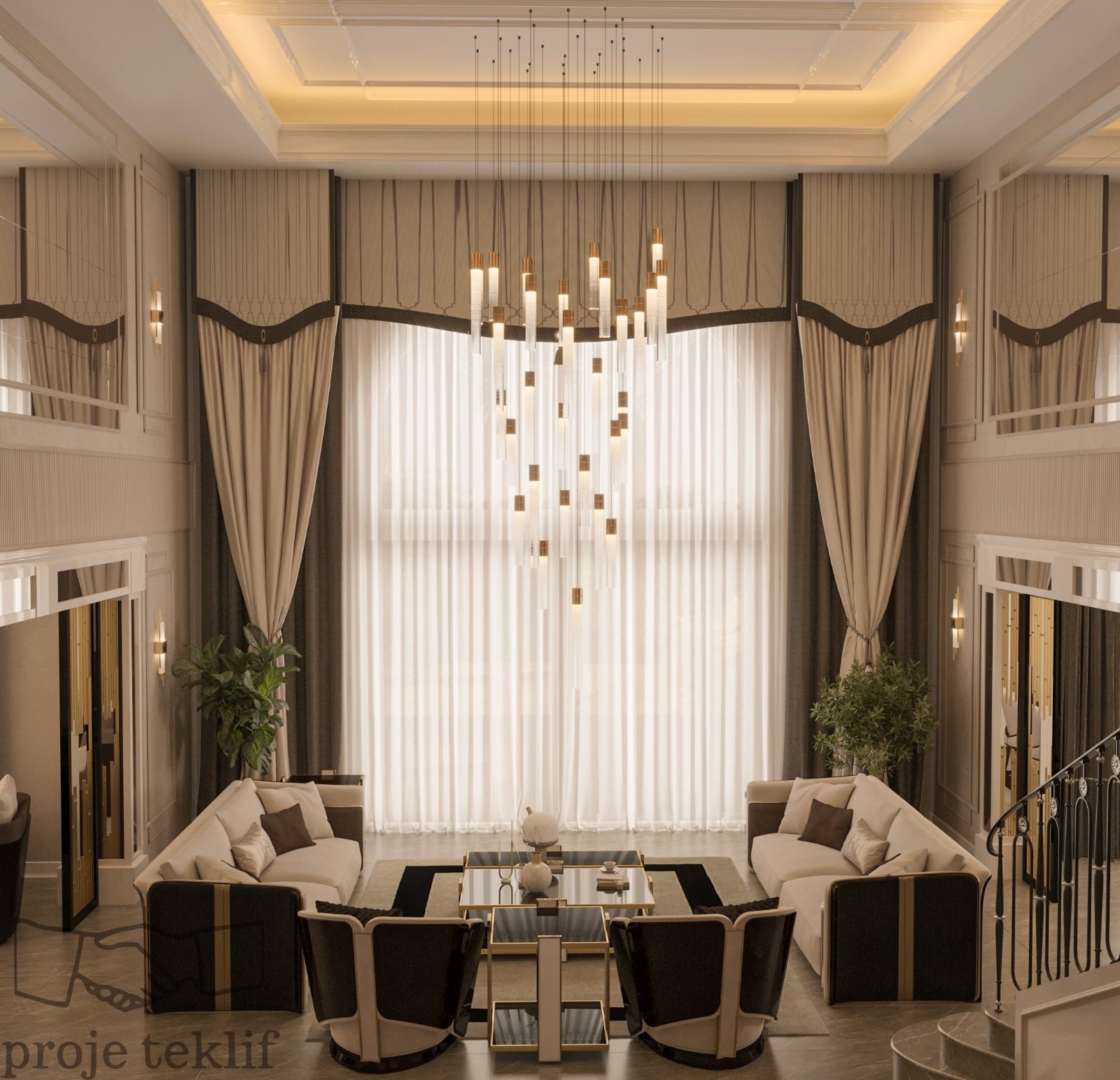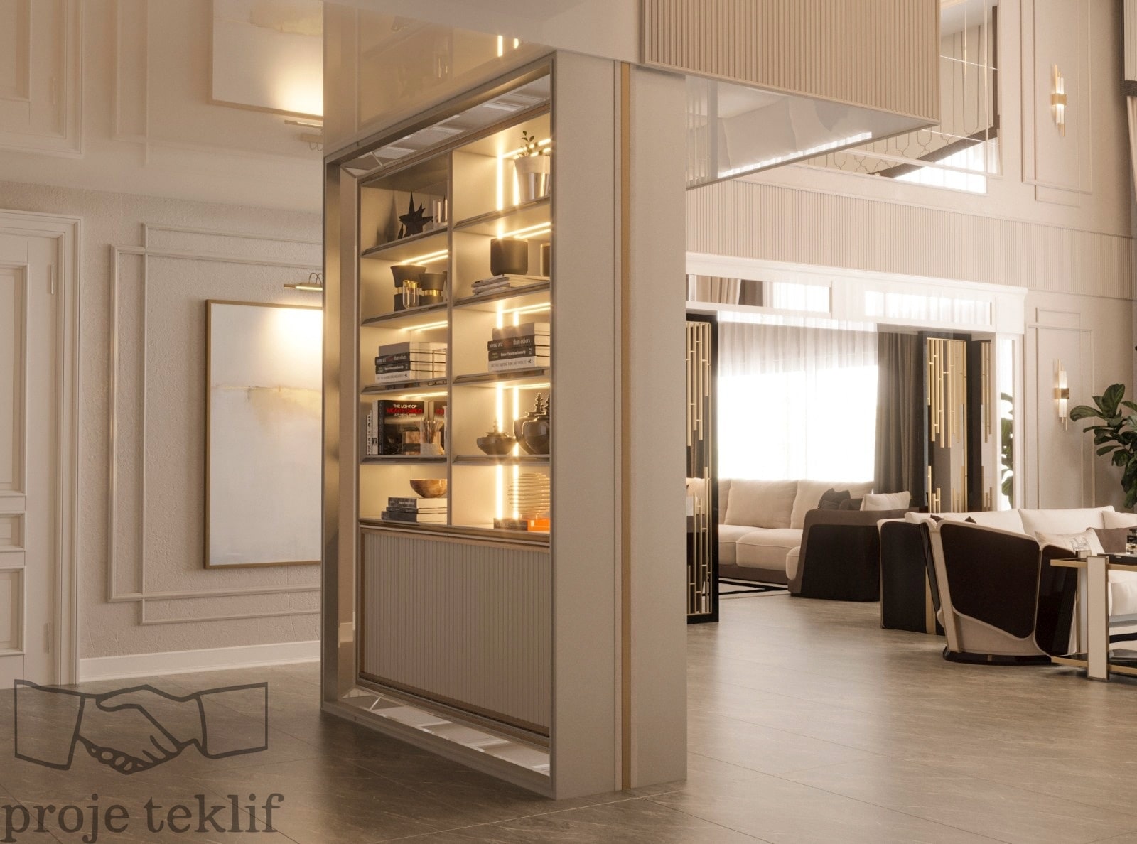Bu projemiz, geniş ve ferah yaşam alanlarına sahip villalarda hem şıklığı hem de doğayla uyumu ön plana çıkaracak şekilde tasarlanmıştır. İç mekânlarda kullanılan doğal dokular, açık renk paletleri ve zarif mobilyalar sayesinde mekanlarda lüks bir sadelik yakalanmıştır. Geniş pencerelerle desteklenen doğal aydınlatma ve mekanlar arası akışkanlık, ferah ve davetkâr bir atmosfer oluşturmuştur.